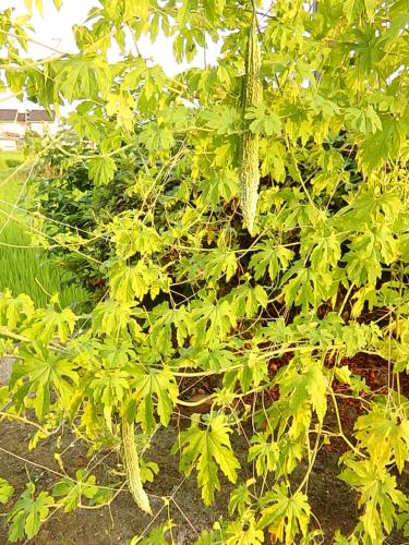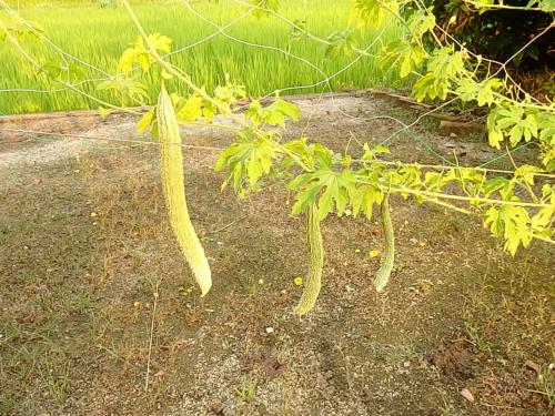 家庭菜園のゴーヤが実を垂らしています。