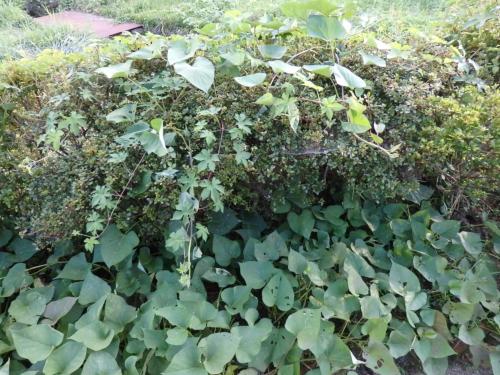 8月末、芋はガンガン伸び芝生地帯に進出。